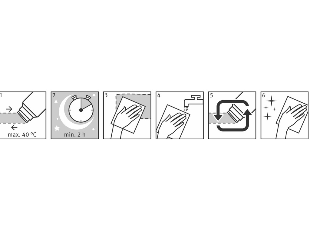- Čistič naneste rovnoměrně na vychladlý povrch (max. 40 °C) a nechte působit minimálně 2 hodiny. Při větším znečištění a připálených usazeninách nechte působit přes noc. Rozpuštěné nečistoty a čistič zcela odstraňte houbou nebo měkkým hadříkem a před leštěním do sucha opláchněte vodou. Po použití štětec opláchněte vodou. Není nutné žádné zahřívání trouby - gel účinkuje při pokojové teplotě Neaplikujte na těsnění dvířek, lakované nebo lakované povrchy/obložky nebo na vnitřní otvory/výstupy spotřebiče. Abyste předešli poškrábání, nepoužívejte abrazivní houbu ani čisticí prostředky z drátěnky. Čistí také plechy na pečení vyrobené ze smaltu nebo nerezové oceli Seznam přísad podle nařízení o detergentech (ES) č. 648/2004